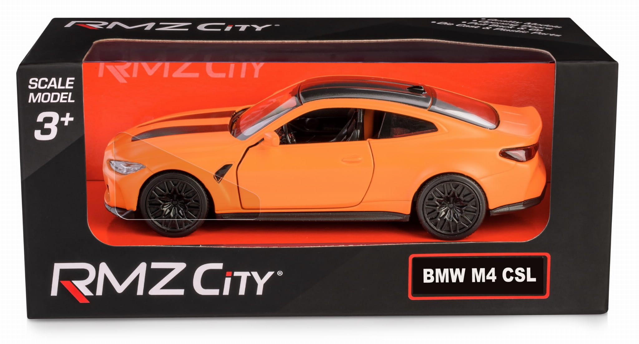 Daffi RMZ City BMW M4 CSL 2023 1:38 – Matowy Pomarańczowy, Pull‑back, Otwierane Drzwi (K-170)