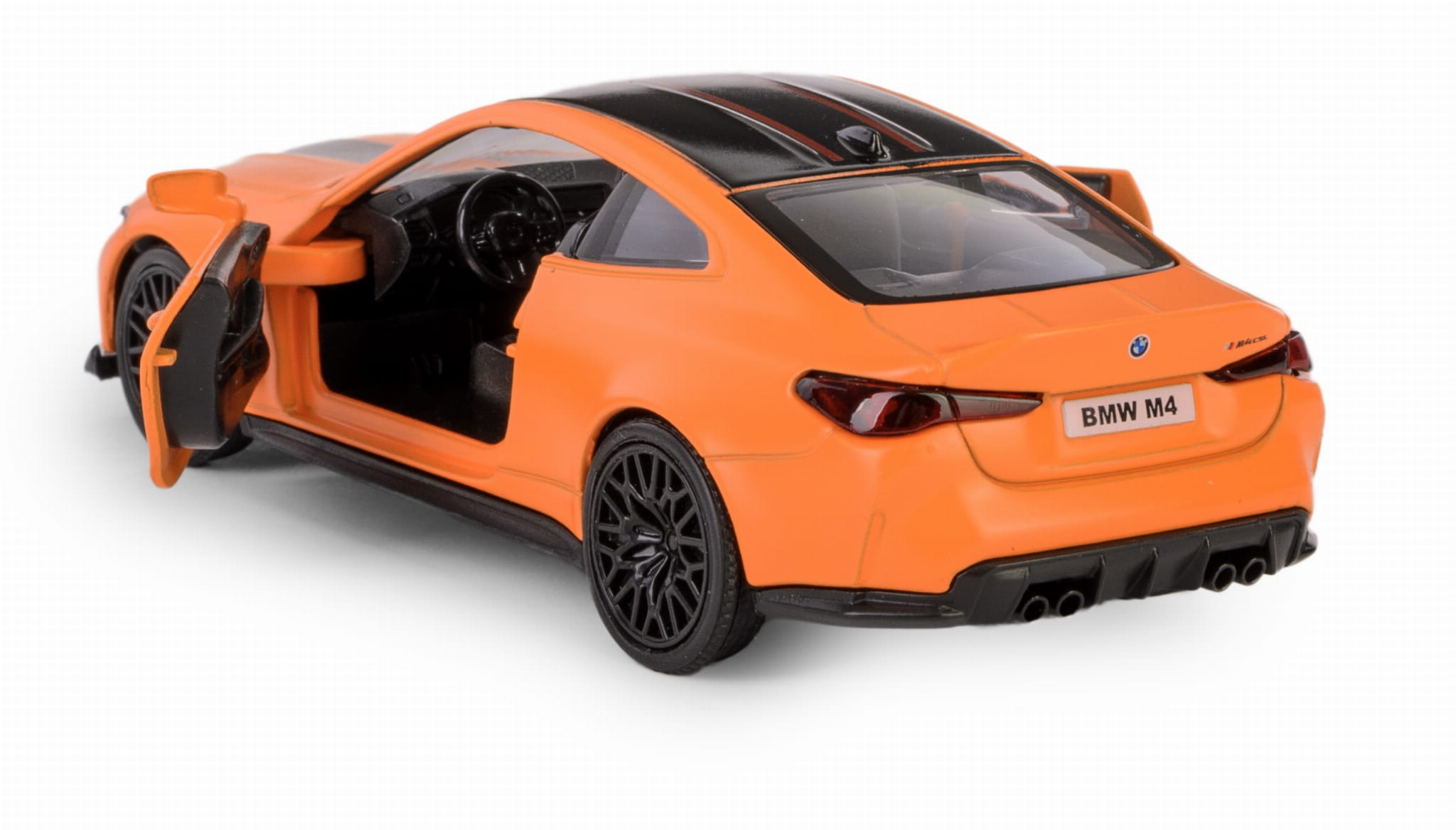 BMW M4 CSL 2023 w skali 1:38 od marki Daffi to starannie odwzorowany model sportowego auta, który od razu przyciąga wzrok matowym, pomarańczowym lakierem.