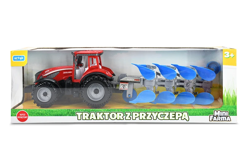 Traktor wyposażony jest w praktyczny napęd frykcyjny, który sprawia, że łatwo wprawić go w ruch. Całkowita długość zestawu wynosi 45 cm, a jego kompaktowe opakowanie (46,5 x 15 x 11,5 cm) jest wygodne w przechowywaniu i transporcie.