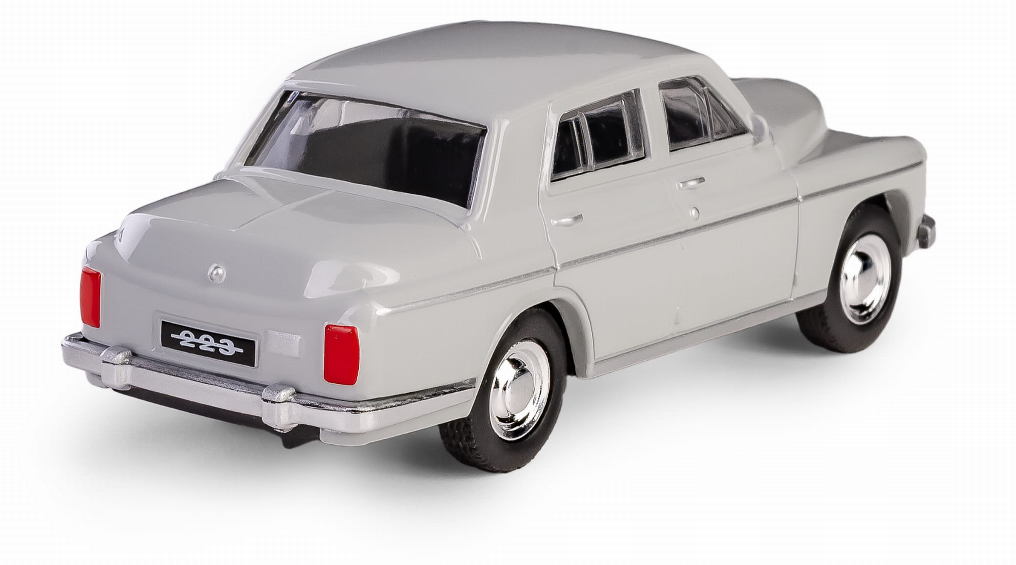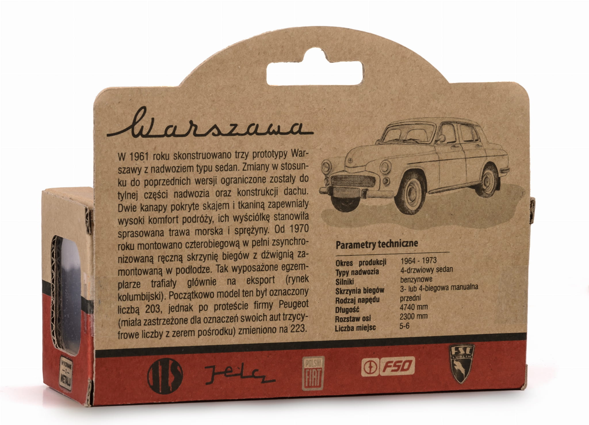 Model Warszawa 223 został wyprodukowany w technologii die cast metal z elementami plastikowymi, co zapewnia wyjątkową trwałość i realistyczny wygląd. Popielate nadwozie oddaje elegancki charakter oryginału, a starannie odwzorowane szczegóły – od sylwetki nadwozia typu sedan, przez linie dachu, aż po tylną część karoserii zmodyfikowaną względem wcześniejszych wersji – pozwalają docenić kunszt projektantów zarówno oryginalnego auta, jak i samej miniatury. Produkt powstał na licencji FSO, co gwarantuje wierność wobec pierwowzoru, a jego jakość potwierdza zgodność z Europejską normą bezpieczeństwa zabawek.