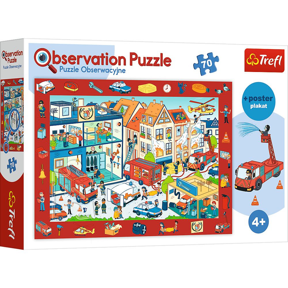 Puzzle obserwacyjne od Trefl to innowacyjna koncepcja, która przedłuża zabawę daleko poza samo ułożenie obrazka. Pierwszym etapem jest tradycyjne układanie 24 elementów – dziecko dopasowuje kształty i kolory, tworząc kolorową scenkę z remizy strażackiej. Plakat 1:1 dołączony do zestawu ułatwia młodszym dzieciom odnalezienie właściwego miejsca dla każdego puzzla. Po ułożeniu rozpoczyna się druga część zabawy – na ramce otaczającej obrazek znajdują się małe ilustracje przedmiotów, postaci i detali, które dziecko musi odnaleźć na głównym obrazku. To jak gra w „szukaj i znajdź", która angażuje dziecko na długie minuty. Kalandrowany papier odbijający światło zapewnia nasycone, żywe kolory, a ekologiczne farby spożywcze gwarantują bezpieczeństwo nawet dla najmłodszych użytkowników.