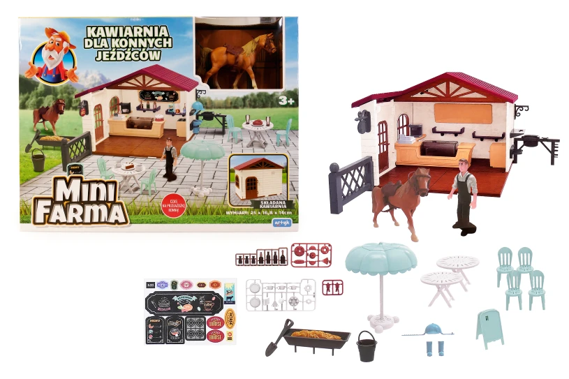 - Zawartość: kawiarnia, figurka człowieka, figurka konia, akcesoria (koryto, wiaderko, parasol, 4 krzesła, 2 stoły, instrukcja).